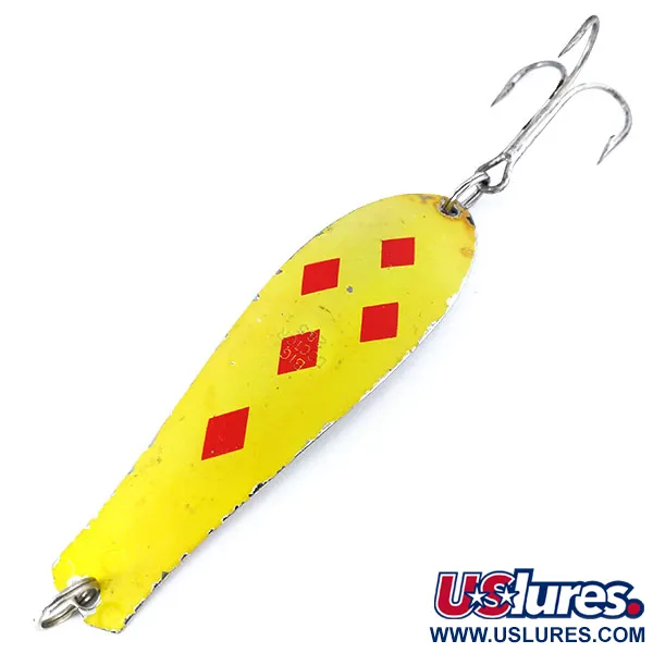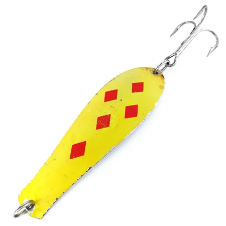 Pět červených kosočtverců ostře kontrastuje s jasně žlutým základem této klasické americké plandavky. S váhou 28 g (1 oz) a délkou 11 cm (4 1/4") zůstává Prescott Spinner Big Doctor 285 UV důležitou volbou pro rybáře cílící na větší dravce při přívlači nebo trollingu. Tento exemplář s produktovým kódem 10718 má hodnocení stavu 4/5, vykazuje drobné známky stáří, ale zachovává si zářivý, vysoce viditelný povrch. Nejvýraznějším technickým aspektem je fluorescenční vlastnost žluté barvy; pod ultrafialovým světlem tělo nástrahy vydává silnou zelenou záři, přičemž červené ražby kosočtverců zůstávají jako tmavé, vysoce kontrastní siluety. Jemný detail se nachází v centrálním kosočtverci, kde je název „Big Doctor“ vyražen přímo do kovu. Nástraha je osazena zesíleným trojháčkem a originálními kroužky, připravena do sbírky nebo k návratu do vody.