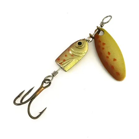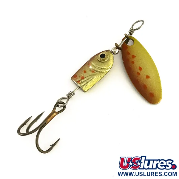 Tato rotační třpytka se značkou původu „Finland“ vyraženou na zadní straně stříbrného listu představuje klasickou éru evropské výroby nástrah. Tento 5cm exemplář s kódem 7889 má speciální tělo ve tvaru rybí hlavy o hmotnosti 4 g. Barevný vzor pstruha potočního je precizně nanesen na olověné tělo a líc oválného listu, tvořený hřejivým zlatým základem s jasně oranžovými tečkami a tmavým, výrazným okem. Na průběžném drátu, který je zakončen těsnými ovinmi a malými kovovými korálky, je připevněn ostrý trojháček. Stav je hodnocen 5/5, což značí velmi zachovalý lak na těle s profilem střevle a čistý, reflexní povrch kovových částí.