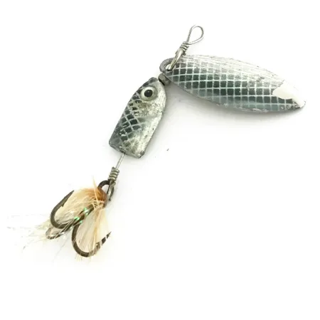 Tato rotační třpytka o hmotnosti 5g, vyrobená ve Finsku, vykazuje kvalitní řemeslné zpracování typické pro finské dědictví této značky. Povrchová úprava Rainbow Silver u modelu Blue Fox Flash Deep Runner se vyznačuje výrazným mřížkovaným vzorem šupin na rotačním listu ve tvaru kapky i na zatížené hlavičce typu minnow, což ji odlišuje od běžných hladkých nástrah. S délkou 5,5cm nese tento kus produktový kód 8318 a je ve stavu 4/5, přičemž si zachovává čistý lesk hardwaru. Design využívá trojháček s přírodním peřím, který vytváří měkký profil za olověným tělem. Sběratelé ocení vyvážení listu a zátěže, což je technické nastavení určené k dosažení konkrétních hloubek při navíjení. Stříbření zůstává jasné, zejména v texturovaných detailech šupin, které definují tuto specifickou barevnou variantu.