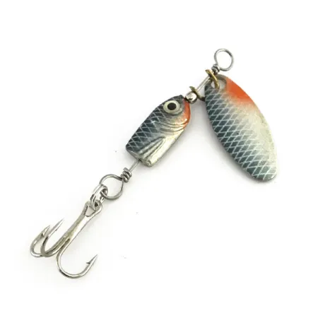 Světle modré šupinové vzory zdobí list i tělo této 4g (1/8 oz) rotační třpytky a podtrhují její klasický finský design. Blue Fox Flash Deep Runner s produktovým kódem 8967 se vyznačuje 5cm (2") profilem postaveným na zatíženém těle ve tvaru malé rybky. Toto tělo má realisticky namalované oko a oranžově tónovanou oblast hlavy, která ladí s detailem na špičce listu typu vrbový list. Zatímco přední strana listu zobrazuje složitý modro-stříbrný motiv šupin, zadní strana je v jednoduchém leštěném stříbře. Mosazný třmen umožňuje listu volně rotovat kolem stříbrného drátěného rámu, který je pomocí kroužku spojen s trojháčkem. Stav je hodnocen 5/5, protože exemplář je výjimečně čistý se sytými barvami a lesklým kovovým hardwarem. Jemné křížové šrafování na kovových površích dodává nástraze na vizuální zajímavosti.