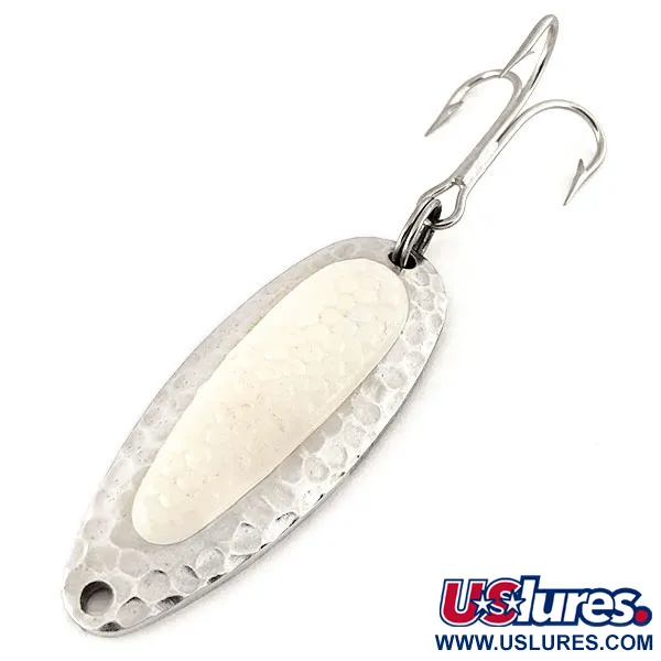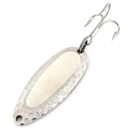 Textury tepaného niklu odrážejí světlo na 14g (1/2 oz) těle této klasické plandavky. Tento exemplář s typickou bílou vložkou v podobě lososího jikry je dokonalým zástupcem řady Blue Fox Pixee, katalogizovaným pod kódem produktu 12317. Zadní strana masivního mosazného těla je jasně opatřena ražbou 'Blue Fox PIXEE PAT. PEND.', která odráží historii designu z éry, kdy značka National Expert Bait (Nebco) přecházela pod Blue Fox. Nástraha o délce 5,5 cm (2 1/4") vykazuje čisté povrchy a ostré ražby, což jí vyneslo hodnocení stavu 5/5. Vyvážená konstrukce je speciálně navržena pro daleké hody na jezerech nebo pro udržení hloubky v silných proudech řek při lovu pstruhů duhových. Pevný kroužek spojuje originální trojháček s koncem nástrahy, což umožňuje její kolébání a rotaci při lovu v příboji nebo v hlubokých říčních tůních.