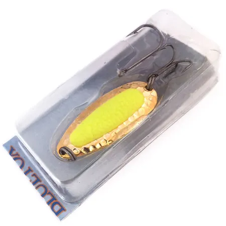 Tato třpytka o hmotnosti 1/2oz (14g) má tělo z masivní mosazi s povrchovou úpravou z pravého 24karátového zlata. Při délce 5,5cm design obsahuje jasně žlutou vložku imitující lososí jikru, která slouží jako bod útoku. Blue Fox Pixee UV s produktovým kódem 10285 je v nepoužitém stavu, uchovaný v originálním balení. Nástraha je zatížena pro daleké hody a stabilitu v říčních proudech, kde se může převalovat u dna. Pod UV světlem nebo ve tmě vložka vydává silnou zelenou záři, což zajišťuje vysokou viditelnost v hlubokých nebo kalných vodách. Tento kus má hodnocení stavu 5/5, bez známek opotřebení zlacení.