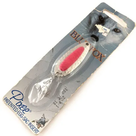 Středem tloukaného niklového listu prochází zářivě růžová fluorescenční vložka v podobě jikerného váčku, která tvoří dominantní vizuální prvek této nástrahy. Plandavka s produktovým kódem 11858 měří 4,5 cm (1 3/4") a váží 7 g (1/4 oz), což jí dodává potřebnou hmotnost pro daleké náhozy i v pobřežním protivětru. Těžká mosazná konstrukce je navržena tak, aby odolala korozivnímu prostředí slané vody a silným říčním proudům. Tato Blue Fox Pixee je nepoužitá, v původním balení s autorskými právy z roku 1984 z éry Cambridge v Minnesotě. UV-reaktivní vlastnosti a tloukaný povrch jsou zkonstruovány pro vysokou viditelnost a odlesky při nahazování i trollingu. Rybáři tento model obvykle využívají pro lov druhů, jako jsou pstruzi duhové (steelhead), lososi a štiky, přičemž využívají jeho schopnost pracovat v hloubce i na mělčině. Na zadní straně karty jsou technické instrukce popisující specializované techniky lake pumping a river tumbling. Exemplář má hodnocení stavu 6, hardware zůstává netknutý z továrny a nikdy nebyl ve vodě.