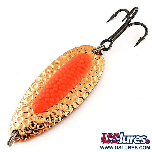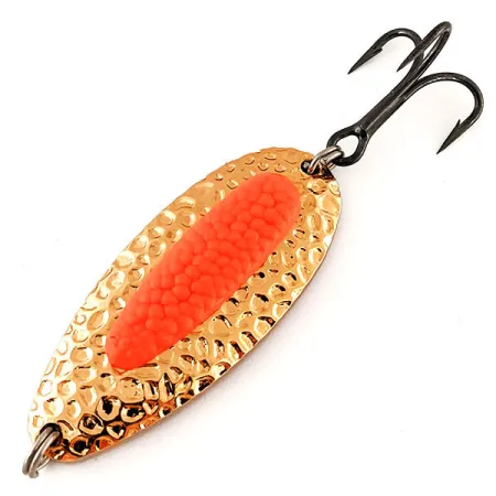 Těžká mosazná konstrukce o hmotnosti 24 g (3/4 oz) definuje tuto plandavku Blue Fox Pixee UV, která byla navržena pro daleké hody nezbytné na řekách a pobřežních vodách. Při délce 6,5 cm (2 1/2") vytváří tepaný povrch v barvě Gold / Pink všesměrné odlesky. Hlavním prvkem tohoto modelu je vložka imitující lososí jikru; zatímco v přirozeném světle vypadá jako zářivě oranžovo-růžová, pod UV spektrem vykazuje výrazný jas pro lepší viditelnost v nepříznivých podmínkách. Tento konkrétní kus s kódem 12187 má silnostěnné tělo, které mu umožňuje pracovat a převalovat se v hlubokých tůních, aniž by při navíjení příliš rychle stoupalo k hladině. Osazení zahrnuje trojháček s tmavou povrchovou úpravou a pevné kroužky, typické pro výrobu v USA. Ve stavu 5/5 zůstává kovový povrch i speciální vložka jasná a nepoškozená, což z této nástrahy činí spolehlivou volbu pro lov pstruhů duhových (steelhead), lososů nebo štik.