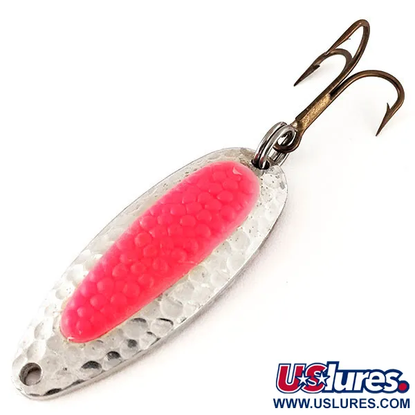 Toto robustní mosazné tělo o hmotnosti 1/2 oz (14 g) je konstruováno tak, aby snadno proráželo pobřežní větry a dosahovalo hlubokých říčních tůní. Délka 2 1/4" (5,5 cm) se vyznačuje klasickým povrchem z tepaného niklu, který je navržen tak, aby rozptyloval světlo podobně jako reflexní šupiny nástražní rybky. Charakteristickým rysem kódu produktu 12363 je unikátní vložka simulující lososí jikru; u tohoto konkrétního modelu Blue Fox Pixee UV poskytuje tato červená vložka vysoce viditelný bod, který intenzivně září v temnější vodě nebo za špatných světelných podmínek. Je osazena trojháčkem s bronzovou povrchovou úpravou a pevným kroužkem, připraveným na nápor při lovu lososů, pstruhů duhových nebo štik. Tato nástraha navazuje na původní vzory National Expert Bait, zdokonalené pro přirozený pohyb v říčních proudech nebo stabilní chod při trollingu. Exemplář je ve vynikajícím stavu, s jasnými důkazy o pečlivém skladování a získává hodnocení stavu 5/5.