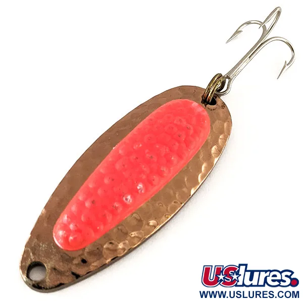 Tepaný měděný povrch na tomto těle z masivní mosazi vytváří výrazné záblesky, které v různých světelných podmínkách napodobují šupiny poraněné kořisti. S délkou 5,5 cm (2 1/4") a váhou 14 g (1/2 oz) je Blue Fox Pixee UV specializovaným nástrojem pro lov v hlubokých říčních tůních nebo pro nahazování v pobřežním větru při lovu lososů, pstruhů duhových a štik. Klíčovým prvkem je vložka imitující lososí jikru v zářivě růžové barvě, která vykazuje vysokou intenzitu záření pod UV světlem. Tento konkrétní kus s produktovým kódem 12447 má klasickou barevnou kombinaci Hammered Copper / Pink. Tato plandavka vyrobená v USA, jejíž design sahá až k firmě National Expert Bait ze 60. let, spoléhá na svou vysokou hmotnost, díky které se převaluje a rotuje i v silných proudech, kde by lehčí nástrahy neudržely hloubku. Osazení zahrnuje robustní trojháček připevněný pomocí kroužku ve spodní části. Stav je hodnocen 5/5, což odpovídá velmi čistému povrchu a jasnému zbarvení vložky.