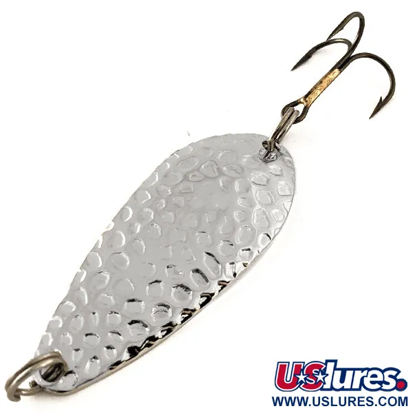 Textura tepaného niklu definuje lícovou stranu této plandavky Blue Fox Strobe a nabízí klasickou estetiku, která zůstává základem pro mnoho rybářů. Nástraha s produktovým kódem 11867 váží 2/5 oz (11 g) a dosahuje celkové délky 2 1/4" (5,5 cm). Tento kus má hodnocení stavu 6, přičemž kovové povrchy a osazení vypadají jako nové z továrny. Na zadní straně je vyražena značka Blue Fox a hmotnost, což odkazuje na její původ v USA. Standardní trojháček je připevněn k ocasní části pomocí kroužku, díky čemuž je nástraha plně funkční a připravená k nahazování nebo trollingu.