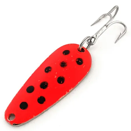 Tato americká plandavka Blue Fox o hmotnosti 1/2 oz (14 g) s kapkovitým profilem je navržena pro efektivní nahazování. Model Tor-P-Do UV o délce přesně 2" (5 cm) s produktovým kódem 12795 má vysoce kontrastní červenou přední stranu s černými tečkami a poniklovanou zadní stranu. Hlavní technickou předností tohoto kusu je fluorescenční, UV reaktivní povrchová úprava, která reaguje na ultrafialové světlo a zajišťuje viditelnost v kalné vodě nebo při slabém osvětlení. Robustní kroužek spojuje tělo s leštěným niklovým trojháčkem pro bezpečný zásek. Každý detail, od čistého laku až po hardware, odpovídá vynikajícímu stavu 5/5. Jednoduchý design umožňuje prezentaci v různých hloubkách, přičemž kompaktní a těžká konstrukce zajišťuje rychlý propad. Předvrtaný otvor v hlavové části poskytuje pevný bod pro přímé navázání nebo použití karabinky.