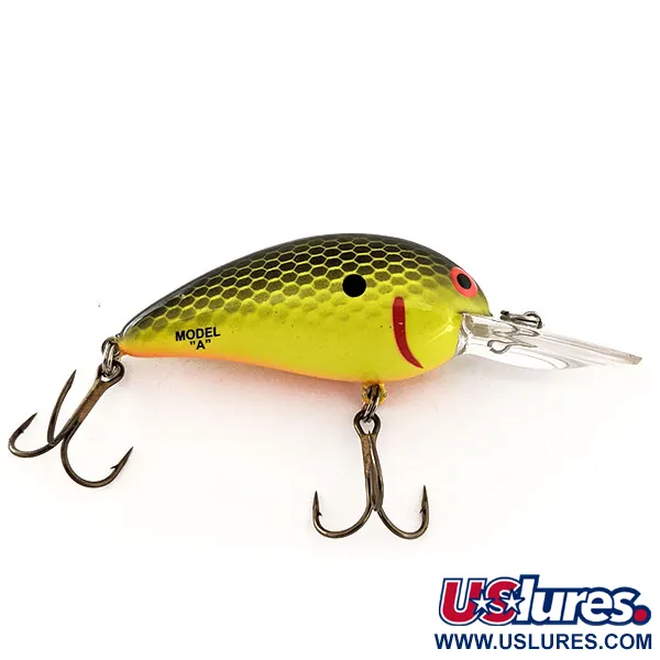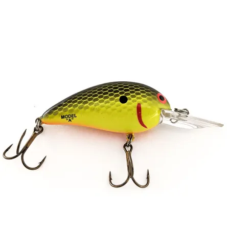 Šupiny v tmavém voštinovém vzoru přecházejí u tohoto 5,5 cm (2 1/4") wobbleru do jasně chartreuse boku. Tento specifický exemplář Bomber B04A UV, identifikovaný klasickým razítkem Model "A" a kódem produktu 11853, je vybaven speciální povrchovou úpravou navrženou tak, aby zářila pod ultrafialovým světlem. Tělo o hmotnosti 8 g (1/4 oz) doplňuje výrazný červený pruh u hlavy a zářivě červené oko. Čirá lopatka je navržena pro dosažení hloubek mezi 0,9 a 2,1 m (3–7 stop), což z něj činí univerzální volbu pro nahazování i trolling. Tato nástraha je ve vynikajícím stavu, hodnocená 5/5, s pevně připevněnými originálními bronzovými trojháčky. Její světelné vlastnosti jsou zvláště užitečné při lovu štik nebo candátů v kalné vodě nebo za špatných světelných podmínek.