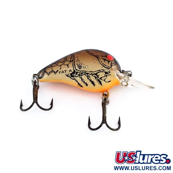 Tento kompaktní ultralehký wobler v barevném provedení CBB má světle hnědé tělo doplněné tmavou grafikou račího krunýře a výrazným oranžovým břichem. S délkou 3 cm (1 1/4") a hmotností 2 g (1/16 oz) slouží jako specializovaný nástroj pro lov okounů a jelců. Čirá lopatka je navržena tak, aby při běžném přitahování dosahovala hloubky mezi 1,2 m (3,9 ft) a 1,8 m (5,9 ft). Tento v USA vyrobený kousek, katalogizovaný pod kódem 9961, má na boku jasně vyražený název modelu „FAT A“. Dva trojháčky v tmavé povrchové úpravě jsou připevněny pomocí robustních kroužků, což odpovídá celkovému špičkovému stavu. Vysoce viditelné červené oči jsou umístěny těsně nad lopatkou a vytvářejí ostrý ohnisko proti tmavě hnědému přechodu na hlavě a hřbetu.