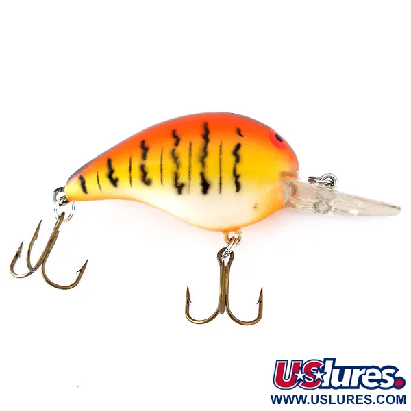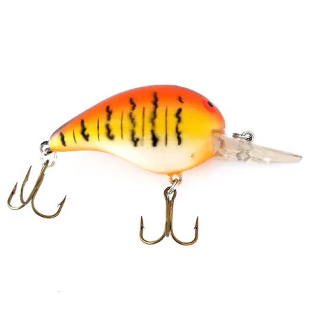 Vzor Red Tiger charakterizuje tento klasický 5cm (2") crankbait, který zaujme vysoce kontrastním oranžovo-žlutým přechodem a výraznými černými svislými pruhy. Tento Bomber Fat A B05F, s produktovým kódem 11083, váží 10 g (1/3 oz) a je určen pro náhozy do hloubek 1,8–2,4 m (5,9–7,9 ft). Tělo má klasický zaoblený profil s tmavě černým pruhem podél hřbetu a břichem v barvě světlé smetany. Čirá potápivá lopatka je osazena pevným kroužkem pro návazec a dvěma originálními trojháčky v bronzové úpravě. Nástraha je hodnocena stavem 5/5, působí mimořádně zachovale, má čisté červeno-černé oči a ostré linie laku. Tento plovoucí model, původem z USA, je základem pro lov okounů a jelců ve středních vrstvách vodního sloupce. Veškeré komponenty včetně kroužků a hrotů háčků si zachovávají svou původní integritu.