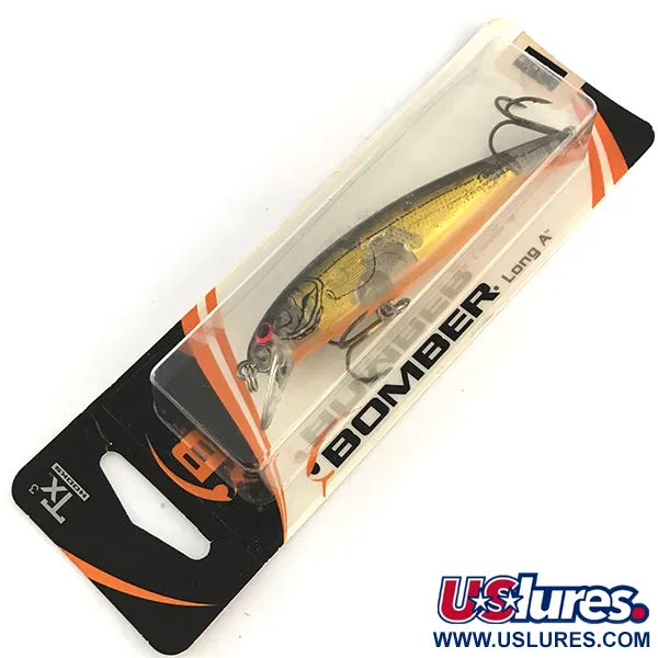 Zlatá vnitřní fólie vytváří třpytivý efekt skrze průhledné plastové tělo tohoto wobleru Bomber Long A B14A. S hmotností 9,5 g a délkou 9 cm je tento model určen pro přívlač i trolling. Při nahazování dosahuje nástraha hloubky 0,6–0,9 m, zatímco při trollingu se potápí do rozmezí 1,2–2,4 m. Kód výrobce pro tuto položku je 8791 a je v nepoužitém stavu. Je vybaven háčky TX3 a má tmavý hřbet, který kontrastuje s metalicky zlatým vnitřkem. Sestaven v Mexiku, je oblíbenou volbou pro lov candátů nebo různých druhů okounů, jako je okounek pstruhový.