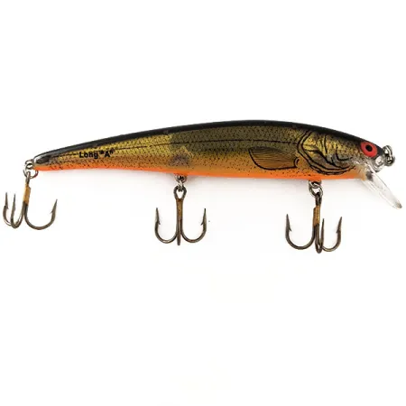 Štíhlý profil tohoto vobleru o délce 12 cm (4 3/4") se vyznačuje klasickým zlato-černým šupinatým vzorem, který kontrastuje se zářivě oranžovým břichem. Na spodní straně jsou pevně uchyceny tři ostré trojháčky, což je standardní konfigurace pro nástrahu této délky. Na boku u ocasu je jasně viditelná ražba „Long 'A'“, která jej označuje jako součást americké výrobní historie značky Bomber. Tento konkrétní exemplář, kód produktu 11840, je vznášivý (suspending) jerkbait s chrastítkem, konstruovaný tak, aby udržel svou pozici ve vodním sloupci v hloubkách 1,2–1,8 m (4–6 ft). S hmotností 14 g (1/2 oz) je nástraha vyvážena pro nahazování i trolling. Červené oči a tmavé detaily žaberních víček tvoří výrazný prvek na metalickém zlatém povrchu. Vnější stav je hodnocen jako čistých 5/5. Čirá plastová lopatka je pevně integrována do špičky a poskytuje potřebný odpor pro zamýšlený rozsah ponoru.