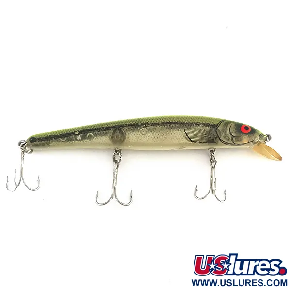Tento štíhlý profil minnow o délce 15 cm (6") je klasickým příkladem modelu Bomber Magnum Long A, označeného produktovým kódem 8407. Celková hmotnost 26 g (1 oz) z něj činí těžkou váhu pro nahazování na mořčáky, candáty a velké druhy okounů. Barevné provedení zahrnuje chartreuse-zelený hřbet, který na bocích přechází v detailní vzor stříbrných šupin, končí průsvitným břichem a je zvýrazněn výrazným červeným okem. Tento kus je ve stavu 5/5, s velmi čistým kováním a čirou lopatkou. Při nahazování dosahuje nástraha hloubky 0,6–0,9 m (2–3 ft), zatímco při trollingu se může potopit do hloubky 1,2–2,4 m (4–8 ft). Tři robustní trojháčky jsou k tělu připevněny pomocí kroužků, což odráží jeho odolnou konstrukci vyrobenou v USA.