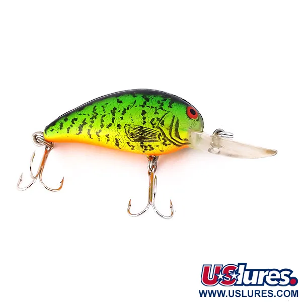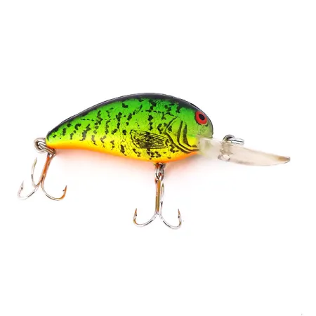 Tato americká varianta Bomber Model A váží 1/3 oz (9 g) a vyznačuje se speciální povrchovou úpravou navrženou pro viditelnost při slabém osvětlení. Tělo je pokryto vysoce viditelným fluorescenčním zeleno-žlutým vzorem s tmavými, mramorovanými skvrnami připomínajícími šupiny, který byl speciálně vyvinut pro UV efekt. Jak je vidět na druhém obrázku, UV-reaktivní barva reaguje pod určitým světelným spektrem, což je technický prvek, který Bomber integroval pro pomoc rybářům cílícím na candáty nebo štiky v hlubokých nebo kalných vodách. Tento wobler s označením Model 6A je navržen pro dosažení hloubek 1,8–2,4 m (6–8 stop) při nahazování i trollingu. Jeho kompaktní 5,5cm (2 1/4") tělo je osazeno dlouhou, čirou plastovou lopatkou a dvěma sadami ostrých trojháčků ve stříbrném provedení. S hodnocením 5/5 zůstává tento kus ve špičkovém stavu, zachovává si zářivé barvy i původní osazení. Klasické červené oko tvoří výrazný bod na hlavě a udržuje tradiční vzhled série Bomber, zatímco využívá moderní technologii svícení ve tmě pod produktovým kódem 10480.