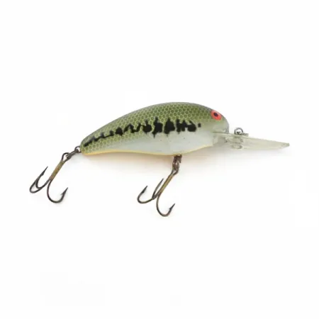 Tento exemplář s klasickým vzorem okouna reprezentuje legendární řadu Model A, známou svým spolehlivým chodem v hloubkách. S hmotností 14 g (1/2 oz) a délkou 7 cm (2 3/4") představuje robustní volbu pro lov v hloubkách mezi 2,4 m (8 stop) a 3,0 m (10 stop). Dlouhá, čirá plastová lopatka je navržena tak, aby nástrahu rychle dostala do hloubky, ať už při nahazování, nebo při trollingu na candáty a štiky. Tělo obsahuje vnitřní chrastítko, které vytváří hlučný profil, jenž je základním znakem americké série Bomber. Pokud jde o osazení, trojháčky vykazují minimální opotřebení a lak zůstává sytý, jen s lehkými známkami předchozího používání. Tento konkrétní Bomber Model 7A, označený produktovým kódem 23821, dosahuje hodnocení 4/5, což odráží péči předchozího majitele. Přechod značky Bomber k plastovým odlévaným nástrahám, jako je tato, způsobil v USA revoluci v lovu u hlubokých struktur. Detail červeného oka tvoří ostrý bod zájmu v kontrastu se zeleným a černým bočním značením.