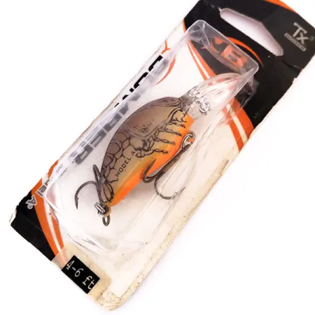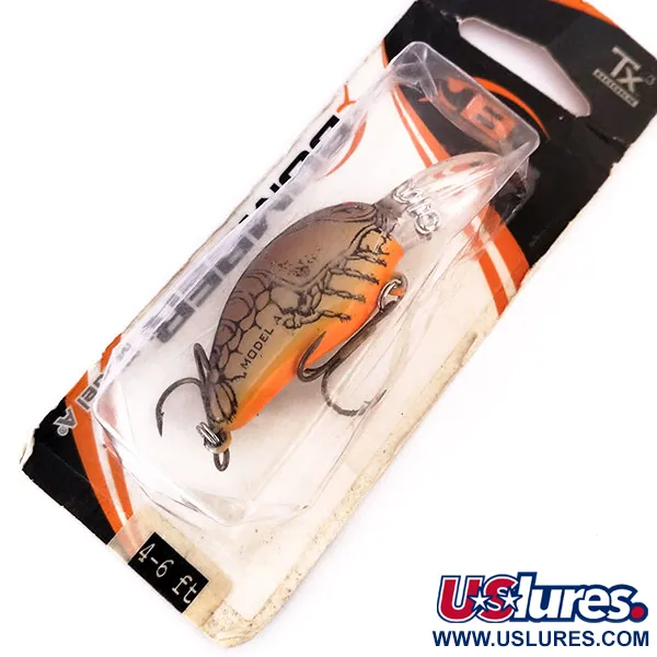 S váhou přesně 9 g (1/3 oz) představuje tento vintage crankbait významnou éru výroby v Ekvádoru. Tělo měří 5,5 cm (2 1/4") a vyznačuje se detailním vzorem připomínajícím raka, který definuje zářivě oranžové břicho a hnědý krunýř s tmavou anatomickou kresbou. Nástraha s označením Model 7A Baby Striper je plovoucí potápivý wobler navržený pro práci v hloubkách mezi 2,4 a 3,0 m (8-10 ft). Rybáři tuto velikost obvykle využívají k přívlači nebo trollingu při lovu candátů a štik. Tento exemplář je nepoužitý a zůstává uchován v původním průhledném obalu, díky čemuž je tovární povrchová úprava i osazení v netknutém stavu. Průhledná lopatka je pevně integrována do špičky, což je charakteristický znak konstrukce řady Model A. Kód produktu: 10284.