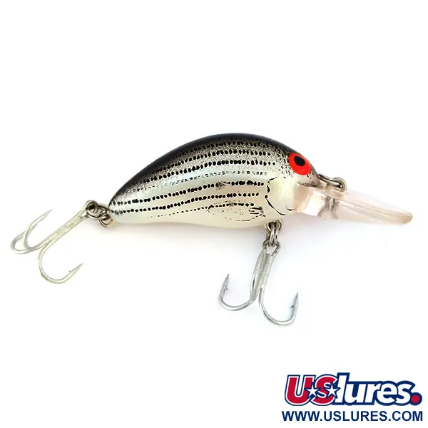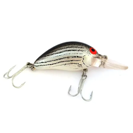 Horizontální černé proužky se táhnou po stříbrném těle tohoto Bomber Model B 4A a vytvářejí vysoce kontrastní vzor doplněný hluboce černým hřbetem. Tato 4,5 cm (1 3/4") nástraha s produktovým kódem 10605 zůstává ve stavu 5/5 a zachovává si zářivě červenou barvu svých naddimenzovaných očí. Čiré potápěčské lopatky jsou navrženy pro hloubky mezi 0,9 m (3 ft) a 2,1 m (7 ft), ideální pro nahazování nebo trolling při lovu štik a candátů. Tento v USA vyrobený plovoucí crankbait váží 7 g (1/4 oz) a je vybaven originálními stříbrnými trojháčky a nerezovým kroužkem u očka.