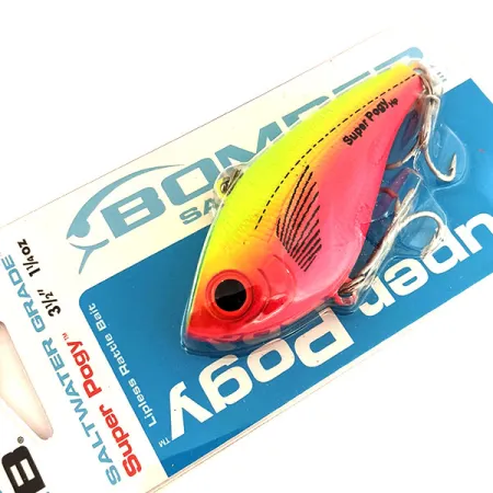 Tato 39g (1 1/3 oz) nástraha v zářivém provedení „Cotton Candy“ disponuje výrazným přechodem z chartreuse barvy do růžové sytě červeným břichem. Tento specifický slanovodní bezlopatkový vibrační wobler (lipless rattle bait) s kódem produktu 11408 měří 9 cm (3 1/2") a je určen pro lov v různých hloubkách. Jedná se o variantu „High Pitch“ (HP) z řady Bomber Saltwater Grade, speciálně zkonstruovanou pro vytváření výrazného akustického signálu pomocí vnitřního chrastítka. Předimenzované černé 3D oči na červené hlavě tvoří jasný bod pro útok dravce. Nástraha je osazena vysoce odolnými mořskými háčky a je v nepoužitém stavu v originálním balení. Zadní strana obalu uvádí vhodnost pro nahazování i trolling při lovu lososů, pstruhů a štik.