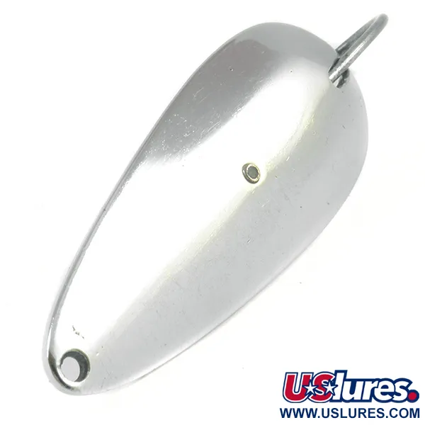 Tato 5,5 cm (2 1/4") plandavka, vyleštěná do vysokého niklového lesku, představuje klasiku amerického designu nástrah do trav z poloviny minulého století. Tony Accetta Weed Doger o hmotnosti 10 g (1/3 oz), identifikovaná pod kódem produktu 3211, využívá robustní jednoháček integrovaný přímo do konkávního těla. Háček je zajištěn výrazným šroubem, který zároveň ukotvuje drátěnou ochranu proti váznutí, což je prvek určený pro nahazování do leknínů a husté vegetace. Na vnitřní straně jsou jasně vyraženy značky 'TONY ACCETTA' a 'WEED DOGER', potvrzující původ v USA. Tento exemplář je ve stavu 5/5 a zachovává si zrcadlový povrch svého kapkovitého těla. Úzký přední konec obsahuje přesně vyvrtaný otvor pro upevnění vlasce, zatímco široký zadní konec tvoří základnu pro pevně namontovanou sestavu háčku.
