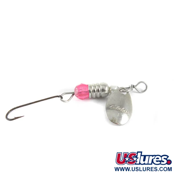 Značka Cabela's a velikost „1“ jsou jasně vyraženy do niklového listu ve tvaru kapky, což odkazuje na původ této nástrahy u legendárního jména americké rybářské historie. Tato rotačka o hmotnosti 2,5 g (3/32 oz) a délce 6 cm (2 1/4") má klasickou konstrukci tvořenou výrazným růžovým broušeným korálkem a drážkovanou niklovou zátěží. Malý bílý distanční korálek sousedící s třmínkem poskytuje jemný vizuální kontrast k leštěným kovovým prvkům. Na drátěném rámu je upevněn jednoháček s dlouhým ramínkem, což je konfigurace často využívaná pro snazší vyproštění háčku nebo při rybolovu na revírech se specifickými pravidly. Tento exemplář vyrobený v USA, identifikovaný produktovým kódem 1540, vykazuje autentický charakter kovových povrchů a zachovává si stav 4/5 při plné strukturální integritě.