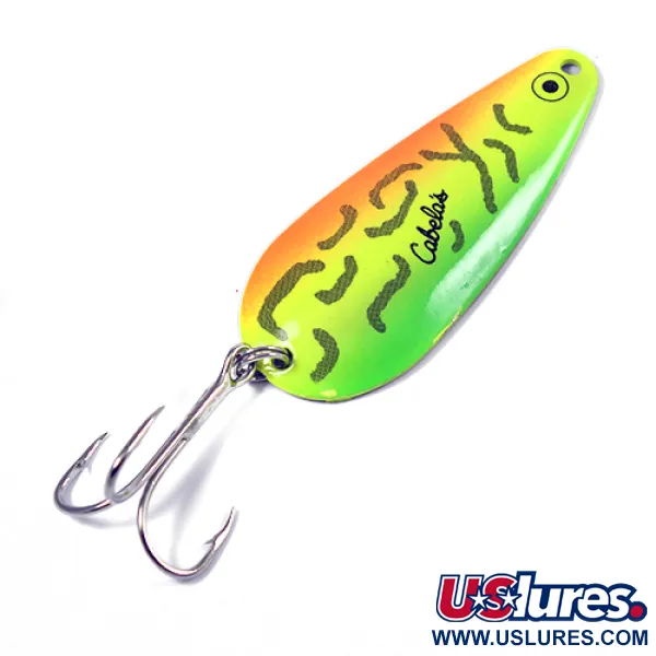 Výrazné vzory Fire Tiger zdobí konvexní stranu této 7 cm (2 3/4") kovové plandavky, přecházející z výrazného oranžového hřbetu do jasně žlutého břicha a limetkově zeleného ocasu. Tato nástraha značky Cabela's s produktovým kódem 2190 je dokladem klasické americké výroby. Přední strana je detailně vyvedena s černými klikatými pruhy a výrazným černým okem, zatímco zadní strana odhaluje vysoce leštěný niklový povrch pro maximální odlesky. Výbava zahrnuje robustní kroužek v základně, který drží lesklý trojháček. Pokud jde o stav, nástraha je v bezvadném stavu, vypadá zcela nepoužitě, což odpovídá hodnocení 5/5. S hmotností 19 g (2/3 oz) je plandavka vhodná pro daleké nahazování nebo vertikální přívlač.