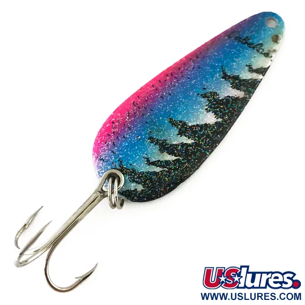 Hmotnost 12 g dodává této plandavce hustotu potřebnou pro daleké náhozy do hluboké vody nebo přes říční proudy. Barevné schéma Pstruh je vizuálně nápadné a vyznačuje se zářivým neonově růžovým a modrým přechodem s výraznými vícebarevnými třpytkami. Podél okraje těla o délce 5,5 cm vytvářejí černé siluety jehličnatých stromů vysoce kontrastní detail na jiskřivém pozadí. Na hlavě nástrahy je čistým černým písmem vytištěn název značky Cabela's. Zadní strana plandavky je vyvedena v zářivě leštěném stříbře, což má vytvářet jasný odlesk, který kontrastuje s malovanou přední stranou. Tento exemplář vyrobený v USA, uváděný pod kódem produktu 8517, je vybaven odolným kroužkem a ostrým trojháčkem. S hodnocením 5/5 je nástraha ve vynikajícím stavu a její povrchová úprava zůstává jasná a neporušená.