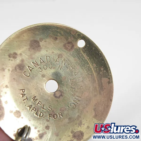 Tento vintage exemplář s kruhovým tělem o hmotnosti 18 g (2/3 oz) pokrývá teplý zlatý povrch. Tento 5cm (2") disk, vyrobený společností Canadian Bait v USA v letech 1960 až 1970, představuje minimalistickou éru designu nástrah. Těžký kovový plátek je uprostřed provrtaný s dalším montážním otvorem u okraje, což poskytuje všestrannost pro různé způsoby nastražení. Je osazen velkým jednoháčkem offset, připevněným přes standardní kroužek, a je konstruován pro odolnost při prezentacích v hluboké vodě. Pod produktovým kódem 0797 vykazuje tato nástraha známky stáří s hodnocením stavu 3/5, přičemž jsou patrné povrchové skvrny a opotřebení podél okrajů kovu. Povrch v barvě mosazi si zachovává solidní lesk, což z něj činí výrazný přírůstek pro každého sběratele zaměřeného na americké náčiní z poloviny století.