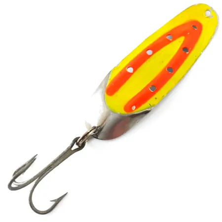 Niklování zajišťuje zrcadlový lesk na zadní straně tohoto modelu 5513, který nese charakteristickou ražbu designéra J. Rustowicze. Plandavka Charger №3 UV o hmotnosti 12,5 g (2/5 oz) využívá vysoce viditelný fluorescenční žluto-červený vzor doplněný devíti specifickými UV reaktivními body navrženými tak, aby zářily v hluboké nebo kalné vodě. Tento exemplář vyrobený v USA měří 8 cm (3 1/4") a představuje evoluci značky nyní vyráběné společností Lake Products. Stav je vynikající 5/5, vykazuje pozoruhodně čistý povrch a zářivé barvy, které vypadají jako nové. Její konstrukce vychází z tradičního profilu plandavky, spojeného s robustním trojháčkem připevněným přes pevný kroužek pro spolehlivé nahazování nebo trolling. Fluorescenční povrchová úprava je integrována přímo do horního smaltu, což zajišťuje, že UV vlastnosti zůstávají účinné za různých světelných podmínek.