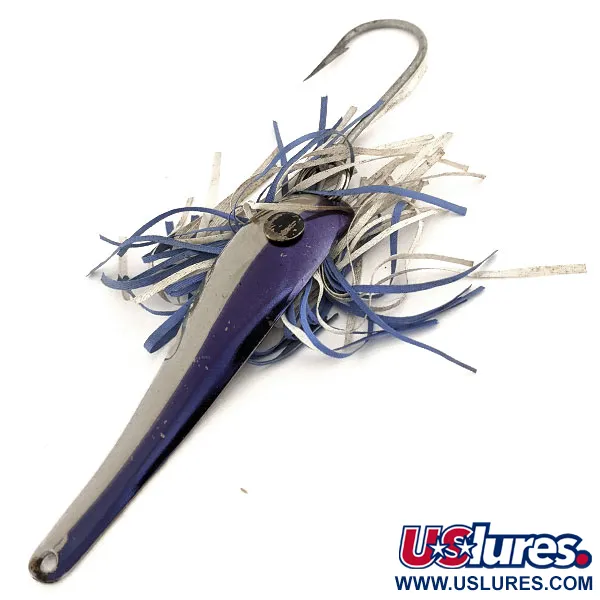Tato klasická trollingová plandavka o hmotnosti 17 g (3/5 oz) vyniká výrazným kontrastem mezi vysoce leštěným niklem a zářivě fialovými bočními panely. Společnost Arnold Tackle Corp z Paw Paw v Michiganu navrhla model Chinco Troller Salmon se štíhlým, zužujícím se profilem optimalizovaným pro hladké vedení vodou při trollingu. Těžké kovové tělo o délce 9 cm (3 1/2") je osazeno velkým jednoháčkem, který je ukryt v bohatých třásních z modrých, bílých a hnědých vinylových vláken. Tento v USA vyrobený exemplář, evidovaný pod kódem 11452, představuje zachovalý kus rybářské historie Velkých jezer. Povrchy a kování vykazují jen velmi mírné známky stáří, což odpovídá špičkovému stavu 5/5. Jediný upevňovací bod na úzkém konci a zesílený siwash háček na rozšířeném konci definují její účelné, funkční provedení.
