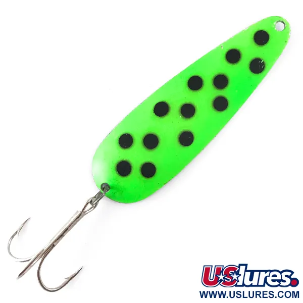 Fluorescenční zelený nátěr dodává této plandavce Chippewa okamžitý vizuální ráz, zejména pod UV světlem, kde jsou její reflexní vlastnosti nejúčinnější. S délkou 9 cm (3 1/2") a hmotností 21 g (3/4 oz) byla tato plandavka modelu 4114 základem pro americké rybáře hledající spolehlivou klasiku v druhé polovině 20. století. Robustní trojháček je připevněn přes silný kroužek k tělu ve tvaru kapky, které zdobí řada výrazných černých teček vytvářejících vysoký kontrast vůči neonovému podkladu. Otočením nástrahy se odhalí ražba 'MADE IN USA' přímo do stříbřitého kovu, což je charakteristický znak výroby společnosti Worth z poloviny století. S hodnocením 5/5 zůstává povrchová úprava výjimečně zářivá a strukturální integrita je vynikající. Tělo o hmotnosti 21 g je dostatečně těžké pro daleké náhozy nebo hlubinný trolling a je navrženo tak, aby efektivně dosáhlo cílové hloubky.