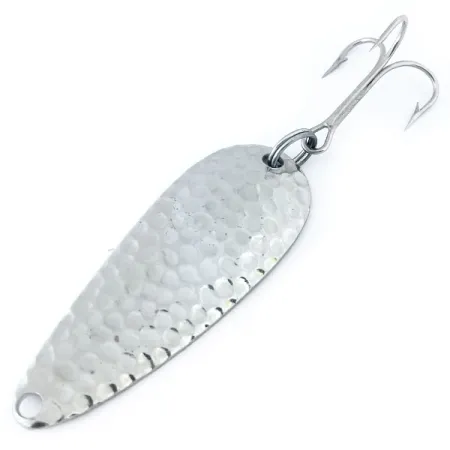 Tepaný niklovaný povrch vytváří vysoce reflexní plochu na této 10g (1/3 oz) plandavce Chippewa Steel Spoon. Textura je speciálně navržena tak, aby odrážela světlo z více úhlů. S délkou 5,5 cm (2 1/4") je tato nástraha od Worth klasickým příkladem amerického kovoobrábění z poloviny století, které dominovalo rybářským krabičkám po celou druhou polovinu 20. století. Přední strana je charakteristická svým důlkovaným vzorem, zatímco zadní strana odhaluje hladký povrch s vyraženým názvem značky a původem USA. Tento kus, označený kódem produktu 10965, si zachovává jasný a čistý vzhled odpovídající hodnocení stavu 5/5. Je osazen jedním velkým trojháčkem připojeným pomocí robustního kroužku v zadní části. Tyto plandavky se používaly pro nahazování nebo trolling při lovu štik, okounů nebo větších pstruhů v různých podmínkách čistoty vody.