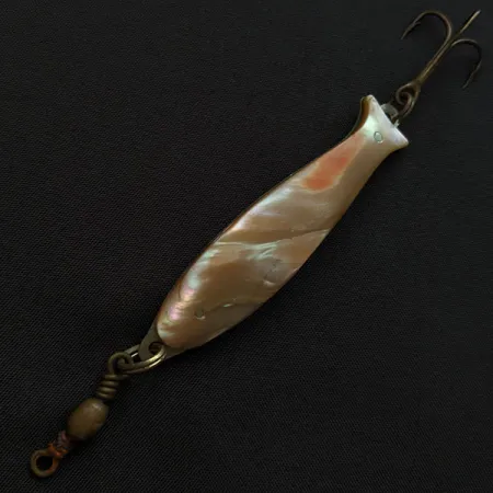 Tato plandavka Compac o délce 7 cm (2 3/4") ztělesňuje precizní japonskou řemeslnou výrobu rybářských potřeb z poloviny minulého století díky použití masivního kusu měňavé perleti. Přírodní lastura je pečlivě vytvarována tak, aby věrně kopírovala rybí profil nástrahy, a k základu ze stříbřitého kovu je přichycena dvěma viditelnými nýty. S hmotností 14 g (1/2 oz) nabízí model 19657 dostatečnou váhu pro nahazování i hlubinný trolling. Kovová zadní strana je vyleštěná do hladka a vytváří kontrast k organickému lesku perleťového vykládání. Nástraha je osazena pevným soudečkovým obratlíkem v očku a bronzovým trojháčkem na konci. Tento konkrétní exemplář je ve vynikajícím stavu, což odpovídá hodnocení 5/5. Původ v Japonsku odkazuje na éru, kdy byla značka Compac známá dovozem osobitě zdobených plandavek, které kombinovaly estetický vzhled s funkční odolností.
