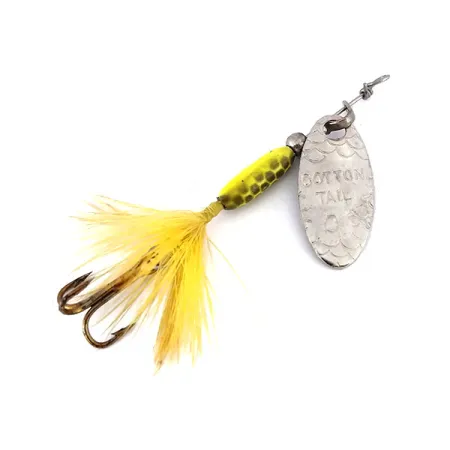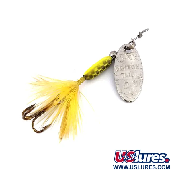 Ražený niklový list zdobí jemný šupinový vzor vedle vyražené značky „COTTON TAIL“. Tato 1,7g (1/16 oz) rotační třpytka je klasikou Cotton Cordell pro lov pstruhů a okounů, vyrobenou v USA. Žluté olověné tělísko s tmavým tečkováním přechází v zářivě žlutý opeřený trojhák, který vytváří přirozený vizuální profil. Při celkové délce 5,08 cm (2") je nástraha ve stavu 5/5 s původním osazením i povrchem. Sběratelé rozpoznají barevnou variantu Nikl/Žlutá podle kódu 10138. Třmen drží list od drátěné osy, což zajišťuje rotaci při každém náhozu a navíjení.
