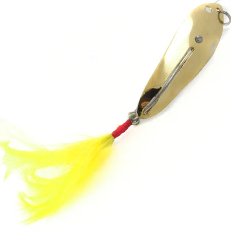 Vysoce leštěný zlatý povrch pokrývá ražené tělo této nástrahy Crippled Alewive, vedené pod produktovým kódem 4137. Tato plandavka o hmotnosti 35g (1 1/4 oz) využívá specifickou bezvázkovou konstrukci včetně ochranného drátku, který chrání hrot hlavního háčku před hustou vegetací. Tělo o délce 10cm (4") je pozoruhodné svou asymetrickou geometrií a neobvyklým uspořádáním sekundárního háčku ukrytého pod žlutým péřovým střapcem. Tato zářivě žlutá pírka jsou k ocasní části pevně přivázána jasně červenou nití, což vytváří výrazný kontrast k metalickému zlatému povrchu. Kovové součásti, včetně šroubem upevněné sestavy háčku a horního kroužku, jsou lesklé a zachovalé, bez známek předchozího použití. Tato konstrukce od společnosti Crippled Alewive Lure se zaměřuje na odolnost při nahazování do hustých porostů.