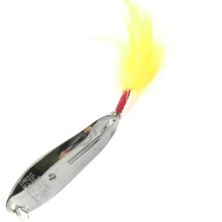 Leštěný niklový povrch odráží světlo na této 6,5cm (2 1/2") plandavce a zdůrazňuje její charakteristický neuváznoucí design. S hmotností 12,5 g (2/5 oz) se nástraha Crippled Alewive vyznačuje neobvyklou konstrukcí, která zahrnuje speciální montážní čep na vnitřní straně těla. Jednoháček je chráněn drátěným chráničem proti váznutí v trávě a ozdoben zářivě žlutým péřovým dráždidlem, upevněným těsným ovinem červené nitě u očka. Na konkávní straně kovu je jasně vidět ražený název „CRIPPLED ALEWIVE“ spolu s původem v USA, což je znak americké výroby z poloviny minulého století. Tento konkrétní exemplář s produktovým kódem 4138 je v hodnocení stavu 5/5, vykazuje velmi čistý povrch pokovení. Kombinace reflexního těla a péřového traileru byla navržena pro rybáře cílící na dravce v husté vegetaci.