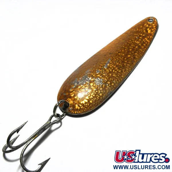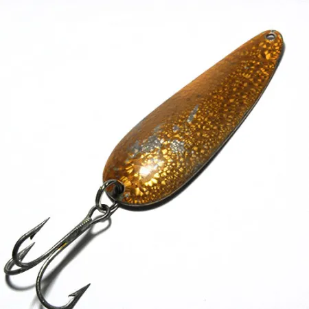 S délkou 3 1/2 palce (9 cm) představuje tato plandavka robustní část sortimentu značky Eppinger. Tento konkrétní model Dardevle s produktovým kódem 0306 se vyznačuje osobitou povrchovou úpravou Crystal (Golden Scale) – texturovaným vzorem v jantarových tónech, navrženým tak, aby odrážel světlo v různých světelných podmínkách pod vodou. Díky hmotnosti 1 oz (28 g) poskytuje potřebnou váhu pro prezentaci v hlubokých vodách nebo pro daleké náhozy. Na konkávní straně si všimnete klasického hluboko vyraženého nápisu DARDEVLE, což je ochranná známka společnosti založené Lou Eppingerem v roce 1906 v Detroitu v Michiganu. Původní velký trojhák zůstává připevněn pomocí robustního kroužku, připraven k akci. Zlatá šupinatá úprava vykazuje mírné opotřebení texturovaného povrchu, což v některých místech, zejména ve střední části a podél okrajů, dává vyniknout jasnému podkladovému kovu. Tento exemplář je čistý a zachovává si silný estetický dojem, což odpovídá hodnocení stavu 3/5. Jedná se o autentický kus americké rybářské historie, který odráží stejnou odolnost, díky níž byly tyto nástrahy kdysi součástí sad pro přežití vojenského letectva.