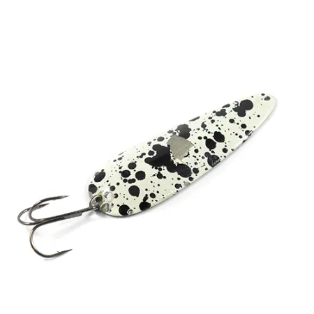 Tato plandavka o hmotnosti 28 g (1 oz) s vysoce kontrastním povrchem v designu „Dalmatian“ představuje unikátní estetickou volbu v legendární nabídce značky Eppinger. Třpytka o délce 9 cm (3 1/2") se vyznačuje specifickým konkávním profilem, který jí při plynulém přitahování dodává charakteristický kolísavý pohyb. Na zadní straně je do poniklovaného povrchu vyraženo „DARDEVLET“ a „DETROIT U.S.A.“, což odkazuje na dědictví výroby, kterou v roce 1906 zahájil Lou Eppinger. Tento konkrétní kus s kódem produktu 2370 je ve stavu 4/5, s dobře zachovalým nátěrem na vypouklé straně a jasným kovovým leskem na straně zadní. Silný plech a ostrý trojháček odrážejí praktičnost, díky které se tyto nástrahy kdysi staly standardní součástí sad pro přežití v armádním letectvu. Použití třpytky s niklovými zády je osvědčenou taktikou v čisté vodě, kde jsou pro upoutání pozornosti zapotřebí maximální odlesky. Kroužky drží pevně a zajišťují trojháček pro náročné nahazování i trolling.