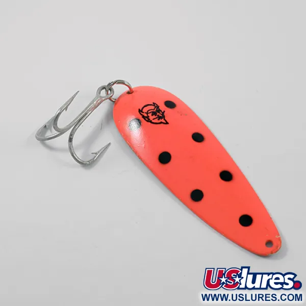 Tato vintage vláčecí plandavka o hmotnosti 28 g (1 oz) je klasickým kouskem historie rybářského náčiní z Detroitu v Michiganu. Přední strana se vyznačuje vysoce viditelným jasně růžovým povrchem zdobeným sedmi černými tečkami a ikonickým logem ďábla Eppinger. Plandavka o délce 9 cm (3 1/2") má na své leštěné niklové zadní straně vyraženo „DARDEVLE DETROIT USA“, což potvrzuje její autentický původ. Tento exemplář, vedený pod kódem 2695, zůstává v kondici 5/5, se zachovalým lesklým smaltem a ostrým písmem na kovu. Výbava se skládá z pevného trojháčku připevněného odolným kroužkem, určeného pro lov velkých sladkovodních dravců, jako jsou štiky nebo muskalungy. Charakteristické tvarování Lou Eppingera je patrné v hlubokém konkávním profilu, což je designový prvek, který zůstal od raných let společnosti prakticky nezměněn. Kontrast mezi zářivě růžovou horní stranou a reflexní niklovou zadní částí zajišťuje viditelnost v různých světelných podmínkách.