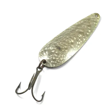 Třpytivý povrch s tepanou úpravou „Crystal“ na této 28g plandavce poskytuje vysoce reflexní plochu, díky které je Eppinger Dardevle stálicí v rybářských krabičkách již více než století. Tento konkrétní exemplář o délce 9 cm (kód produktu 2696) se vyznačuje klasickým podlouhlým, konkávním tvarem těla, který Lou Eppinger zdokonalil v Detroitu v roce 1906. Těžká kovová konstrukce a značná hmotnost z ní činí vynikající volbu pro daleké nahazování nebo trolling. Je vybavena robustním trojháčkem připevněným pomocí kroužku, přičemž vykazuje mírné známky používání odpovídající stavu 4/5. Tyto nástrahy vyrobené v USA jsou proslulé svou spolehlivostí a tepaná textura je navržena tak, aby rozptylovala světlo do více směrů a napodobovala šupiny nástražní rybky. Řemeslné zpracování této klasiky z Dearbornu v Michiganu je patrné v každém detailu, od přesného ražení až po pevný hardware.