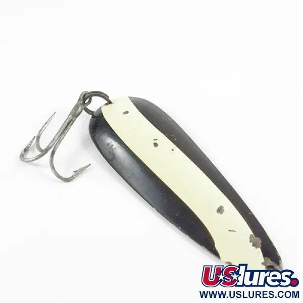 Tato plandavka Eppinger Dardevle o hmotnosti 28 g (1 oz) se vyznačuje vysoce kontrastní černou povrchovou úpravou s jediným krémově bílým pruhem uprostřed. Tělo ve tvaru kapky o délce 9 cm (3 1/2") odráží dědictví Lou Eppingera z Detroitu roku 1906 a využívá patentované raznice vyrobené v USA k vytvoření svého charakteristického konkávního tvaru. Nástraha s produktovým kódem 2840 je zkonstruována pro náročné těžké nahazování a trolling při lovu velkých dravých ryb. Masivní kovová konstrukce je osazena dobovým trojháčkem zajištěným robustním kroužkem v ocasní části. Vizuálně je tento kus ve stavu 3/5, přičemž barva vykazuje známky běžného opotřebení a lehké oděrky podél hran, které odhalují historii jejího používání v terénu. Tato varianta s krémově bílou zadní stranou nabízí pod vodní hladinou výrazný vizuální profil a zachovává si funkční design, díky němuž si tyto plandavky kdysi vysloužily místo v sadách pro přežití vojenského letectva. Vysoká gramáž kovu zajišťuje, že při stahování dosáhne požadovaných hloubek, což z ní činí spolehlivý nástroj pro lov dravců v různých vodních podmínkách.