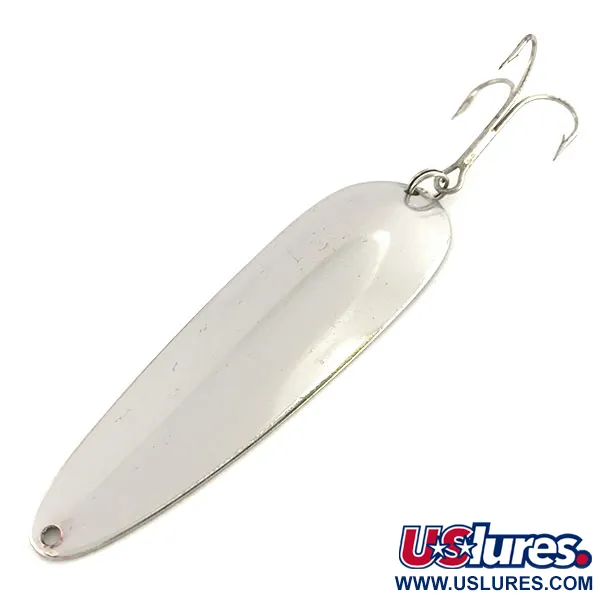 Tato klasická plandavka o hmotnosti 28 g (1 oz) je skutečným dříčem z dílen Eppinger. Jasný niklový povrch brilantně odráží světlo a dává na odiv vysoce kvalitní pokovování, díky němuž se tyto nástrahy zrozené v Detroitu staly legendárními. Na konkávní spodní straně najdete ostrý nápis „DARDEVLE“ spolu se značkou „DETROIT. U.S.A.“, což ji řadí do éry před stěhováním společnosti do Dearbornu v roce 1959. Tento exemplář o délce 9 cm (3 1/2"), identifikovaný pod kódem 9164, se vyznačuje ikonickým kapkovitým profilem určeným pro výrazný kolísavý pohyb při pomalém navíjení. Výbava je mimořádně robustní, s pevným trojháčkem zajištěným silným kroužkem na širším konci. Tato konkrétní nástraha je ve stavu 5/5 a zachovává si zrcadlový povrch po celém kovovém těle. Tyto plandavky představují více než století amerického řemesla a využívají patentované formy, které Lou Eppinger proslavil výrobou nástrojů tak účinných, že byly kdysi součástí leteckých sad pro přežití.