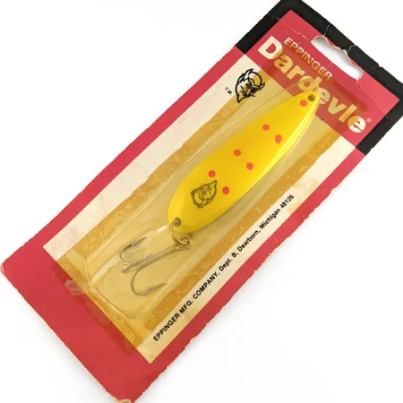 Na lícové straně této 28g plandavky svítivě žluté barvy je precizně rozmístěno pět výrazných červených teček. S délkou 8,5 cm představuje Dardevle Cop-E-Cat od společnosti Eppinger (kód produktu 21647) robustní volbu pro lov velkých sladkovodních dravců. Na těle plandavky je vyraženo charakteristické logo s hlavou ďábla, typický znak firmy Eppinger Mfg. Company z Dearbornu v Michiganu. Zatímco zadní strana původního kartonového obalu označuje model jako 752e Nickel, tento konkrétní kus má na vypouklé straně vysoce viditelnou žlutou povrchovou úpravu. Nástraha nebyla použita a zůstává zatavena v původním historickém blistru. Kování vyrobené v USA je osazeno pevným trojháčkem určeným pro přívlač i trolling. Na podkladové kartě je stále viditelná původní adresa oddělení B a zmínka o nabídce katalogu za jeden dolar.