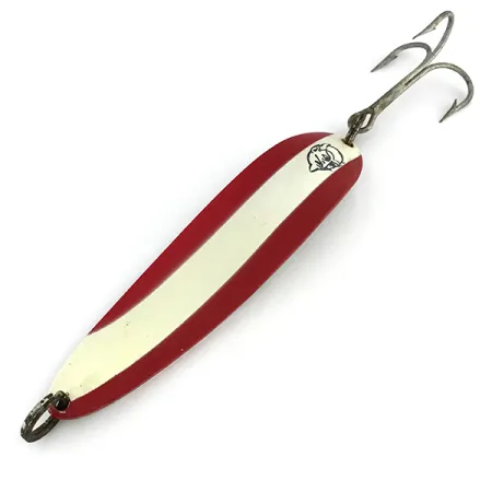 Tato plandavka Dardevle Cop-E-Cat 7000 s úctyhodnou hmotností 100 g (3 1/2 oz) představuje těžší kalibr z legendární produkce značky Eppinger. Nástraha o délce 13,5 cm (5 1/4") se pyšní klasickým barevným provedením Červená/Bílá/Nikl s čistým bílým středovým pruhem a výraznými červenými boky. Přední stranu zdobí charakteristické logo s hlavou ďábla, zatímco na leštěné zadní straně je vyražena značka Eppinger Mfg. Co., Dearborn, Michigan, USA. Označení Dearborn datuje její původ do období po roce 1959, kdy se firma přestěhovala z Detroitu, což odkazuje na slavnou éru americké výroby rybářských potřeb. Tento exemplář s produktovým kódem 8280 je ve stavu 5/5, lak si zachovává původní lesk a robustní kování je ve výborné kondici. Velký ostrý trojháček je zajištěn silným kroužkem a druhý kroužek v přední části slouží jako bezpečný bod pro připevnění těžkých návazců.