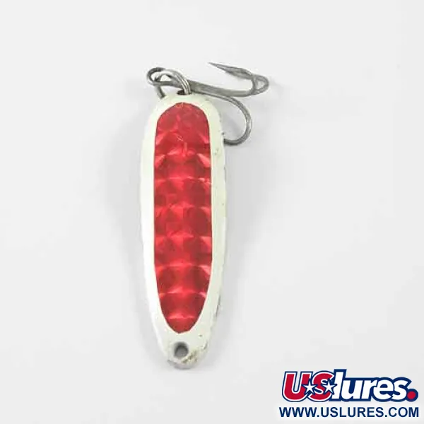 Texturovaná červená šupinatá páska vytváří výrazný odlesk proti bíle smaltovanému okraji této klasické plandačky Eppinger. S délkou 5,5 cm (2 1/4") má Cop-E-Cat 7300 značnou hmotnost 14 g (1/2 oz), navrženou pro daleké nahazování nebo trolování. Na zadní straně nástrahy se nachází leštěný niklový povrch, kde je přímo do kovu vyraženo označení „COP-E-CAT 7300 Eppinger U.S.A.“. Tento konkrétní kus má hodnocení stavu 4/5, vykazuje dobře zachované pigmenty a čistý povrch. Kód produktu 1380 identifikuje tuto barevnou konfiguraci v katalogu michiganské společnosti, která vyrábí rybářské náčiní již od roku 1906. Jeden trojháček je k ocasní části připevněn pomocí kroužku, připraven k lovu ve sladkých vodách.