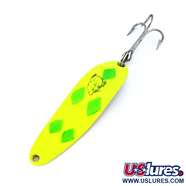 Výrazná ražba COP-E-CAT 7300 DETROIT U.S.A. na leštěné niklové zadní straně identifikuje tuto klasickou plandavku jako kus rybářské historie Michiganu. Tento 5,5cm exemplář má zářivě žlutou přední stranu s pěti fluorescenčními zelenými kosočtverci, což je vysoce viditelný vzor navržený pro různé hloubky vody. Při hmotnosti 10 g spoléhá akce nástrahy na specifický konkávní tvar, který firma Eppinger zdokonaluje již od roku 1906, aby zajistila pohyb při trollingu nebo přívlači. Tento konkrétní kus, označený produktovým kódem 10360, má původní UV reaktivní povrchovou úpravu, která poskytuje technickou výhodu při slabém osvětlení. Přední strana vykazuje několik lehkých povrchových stop a mírné opotřebení středové černé grafiky Dardevle, zatímco kovová zadní strana si zachovává čistý, reflexní lesk. Osazení tvoří jeden velký trojháček zajištěný pevným kroužkem. Tato dobře udržovaná vintage nástraha má hodnocení stavu 4/5, vykazuje drobné známky času stráveného v krabičce, ale zůstává plně funkční.