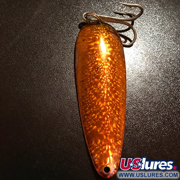 Tato plandavka o hmotnosti 28 g (1 oz) a délce 9 cm (3 1/2") se vyznačuje nezaměnitelnou povrchovou úpravou „Crystal“, která odráží světlo přes texturovanou lícní stranu v oranžových tónech. Tento konkrétní kus s produktovým kódem 10963 má hodnocení 4/5 a vykazuje mírné povrchové opotřebení, které odpovídá jeho autentickému stáří při zachování brilantního lesku. Na zadní straně z tepané mědi jsou jasně vyražena slova „DARDEVLE DETROIT, USA“, což je charakteristický znak rané historie výroby společnosti před jejím stěhováním do Dearbornu v roce 1959. Měděná zadní strana je funkční volbou pro tuto nástrahu, protože rybáři tradičně využívají tento kovový tón k udržení viditelnosti v přikalené nebo zakalené vodě. Její charakteristický konkávní profil je navržen tak, aby při plynulém přitahování produkoval jedinečný kolébavý pohyb. Výbava zahrnuje pevný stříbrný kroužek a ostrý trojhák, určený pro zdolávání velkých dravých ryb. Tato klasika od Eppingera zůstává důkazem původní vize Lou Eppingera z roku 1906 o spolehlivé nahazovací plandavce.