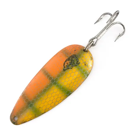 Leštěné niklování na zadní straně této 21g (3/4oz) plandavky skvěle odráží světlo a nese výrazné ražby „DARDEVLET“ a „DEARBORN MI“, které sběratelé vyhledávají. Přední strana této nástrahy o délce 7 cm (2 3/4") představuje nápadnou kombinaci oranžových a zelených odstínů uspořádaných do křížového vzoru. Jemná textura s motivem včelí plástve dodává lakovanému povrchu třpyt, zatímco slavné logo s černou hlavou ďábla zůstává ostré. Plandavka, označená produktovým kódem 8412, je vyrobena pomocí vlastních raznic společnosti Eppinger, což zajišťuje specifickou hloubku prohnutí nezbytnou pro její typický kolísavý pohyb. Osazení je ve skvělém stavu, zahrnuje pevný kroužek a lesklý trojháček. Tento kousek z továrny v Dearbornu, která se stala domovem značky v roce 1959, je vynikajícím příkladem historie amerického rybářského náčiní. Stav je hodnocen 5/5, což dokládá klasickou kvalitu výroby z Michiganu.