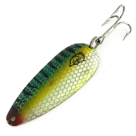 Na zadní straně v barvě mosazi je jasně vyraženo jméno „DARDEVLET“ spolu s místem původu „DEARBORN MI“ a označením hmotnosti „3/4 OZ.“. Tato 21g (3/4 oz) plandavka má výrazný vzor Okoun, vytvořený s voštinovou texturou připomínající šupiny na zářivém žluto-zeleném gradientu. Tmavé svislé pruhy zajišťují realistický kontrast, doplněný jemným červeným akcentem u očka na vlasec. Přední strana nese ikonické logo černé hlavy ďábla, značku firmy Eppinger již od jejího založení v roce 1906. Nástraha měří 7 cm (2 3/4") a je osazena robustním trojháčkem připevněným pomocí kroužku v zadní části. Tento exemplář s kódem produktu 8442 zůstává ve výjimečném stavu a získal hodnocení 5/5 pro čistý povrch a ostré ražení. Vzhledem k tomu, že Eppinger přesunul výrobu do Dearbornu v roce 1959, slouží tato nástraha jako zásadní kus historie rybářského náčiní z Michiganu. Je vyrobena z masivní mosazi a její vyvážený profil je určen pro nahazování a trolling v různých podmínkách.