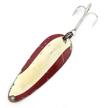 Výrazný povrch Red Devle definuje tuto vintage plandavku, vyznačující se ikonickým bílým středovým pruhem mezi dvěma karmínovými poli. Tento 21g kus nese autentické známky používání s viditelnou ztrátou barvy a odštěpky podél okrajů, což odráží jeho historii v krabičce s nástrahami se stavem hodnoceným jako 3/5. Tělo z masivního kovu o délce 7 cm má na zadní straně vyraženou klasickou identifikaci „DARDEVLET“ DETROIT U.S.A., typický znak produkce firmy Eppinger z období 1920–1940. Pod katalogovým kódem 22794 je nástraha osazena pevným kroužkem a jedním velkým trojháčkem v ocasní části. Kovová zadní strana zůstává lesklá a kontrastuje s opotřebovaným smaltem na přední části. Tato nástraha vyrobená v USA byla navržena pro nahazování do hlubších vod, kde její specifická hmotnost umožňovala dosáhnout hloubek, do kterých se menší plandavky nedostanou.